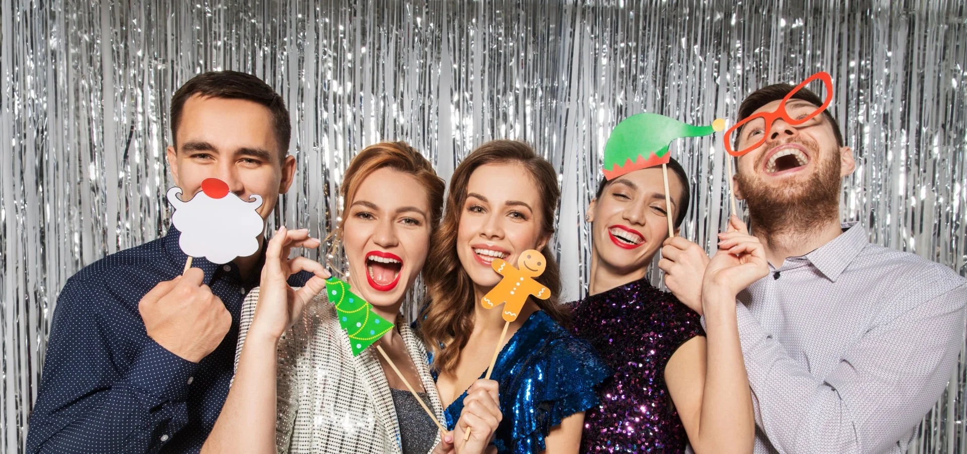 Every holiday photo booth rental gets a silver tinsel curtain backdrop, 6.5' x 6.5